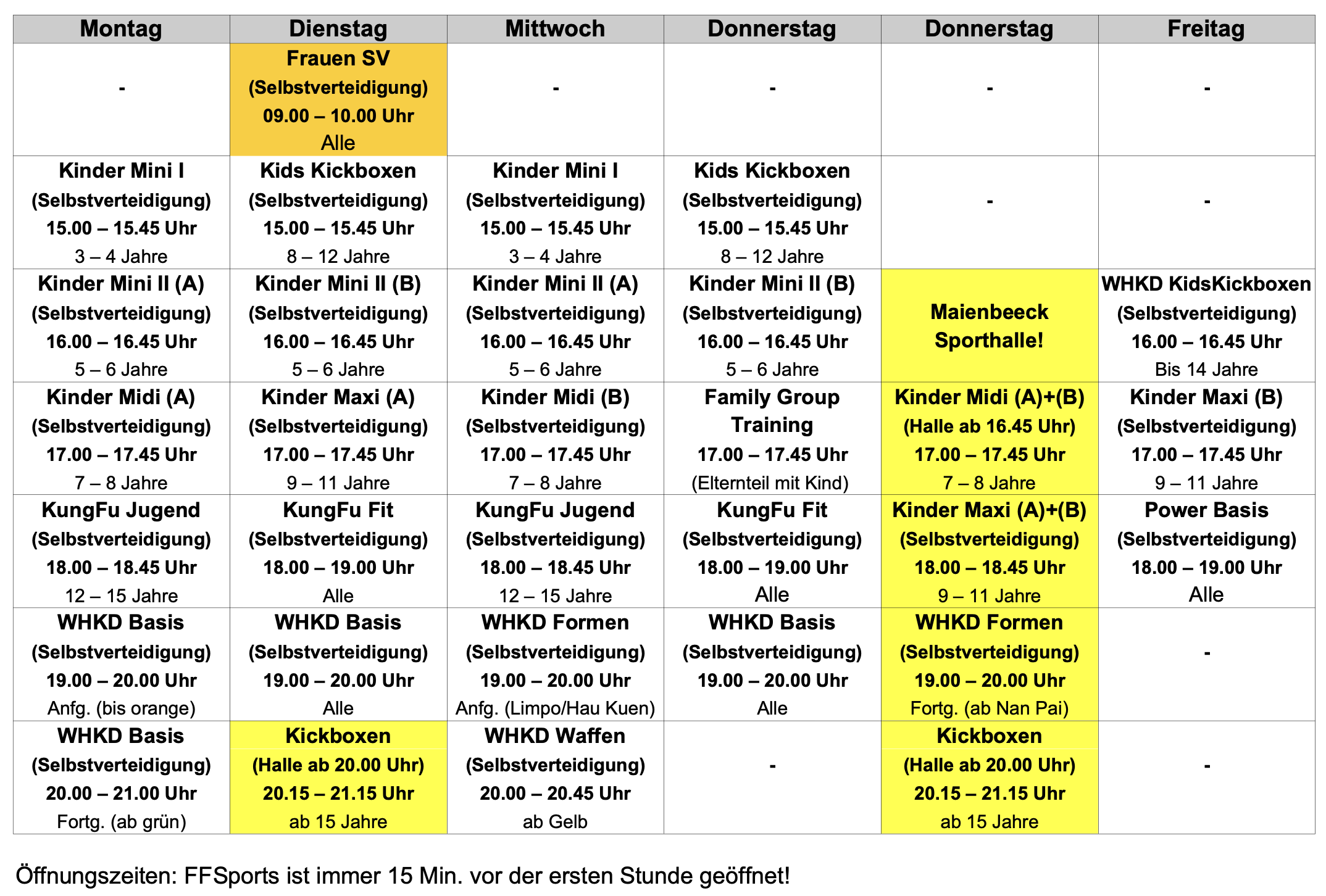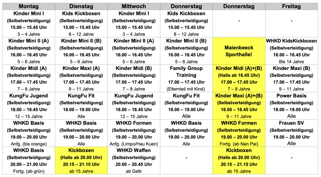 Die gelb markierten Kurse werden in der Maienbeecksporthalle durchgeführt.